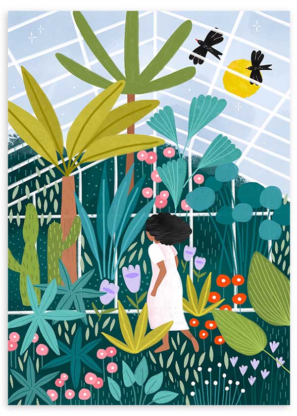 Cuadro ilustrado colorido de estilo contemporáneo creado por Bea Muller. La escena muestra a una mujer con vestido blanco paseando entre plantas exóticas y flores vibrantes en un invernadero iluminado por el sol. Los tonos verdes, lilas, naranjas y amarillos transmiten frescura, energía y vitalidad, convirtiéndolo en una pieza ideal para dar un aire alegre y artístico a salones, dormitorios o espacios creativos.