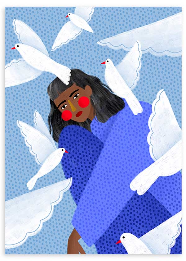 Cuadro ilustrado colorido de Bea Muller con una mujer vestida en azul rodeada de palomas blancas en pleno vuelo. Una composición vibrante y expresiva que combina serenidad y movimiento, ideal para decorar salones, dormitorios o espacios creativos con un aire artístico y contemporáneo.