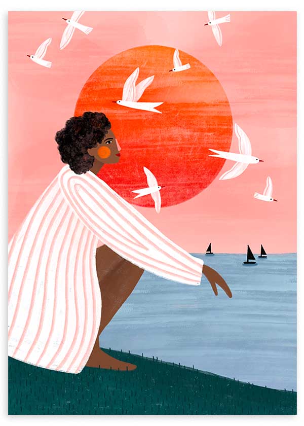 Cuadro ilustrado colorido de Bea Muller con una mujer sentada frente al mar al atardecer, acompañada de gaviotas que vuelan alrededor de un gran sol naranja. Una obra que transmite calma, contemplación y conexión con la naturaleza, ideal para aportar calidez y estilo a salones, dormitorios o espacios creativos.