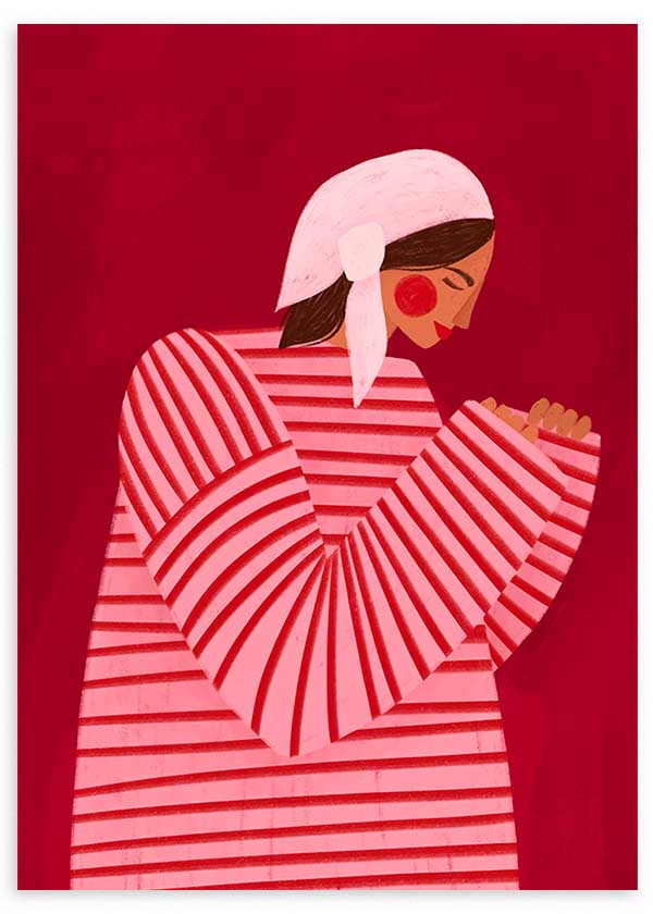 Cuadro ilustrado colorido de Bea Muller que representa a una mujer con pañuelo blanco en la cabeza y camisa de rayas rojas y rosas. La figura aparece sobre un intenso fondo rojo, transmitiendo fuerza, carácter y sensibilidad. Una pieza artística que aporta un aire moderno y expresivo a cualquier estancia, ideal para salones, dormitorios o espacios creativos.