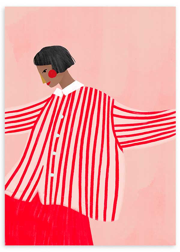 Cuadro ilustrado colorido de Bea Muller que muestra a una mujer con cabello corto y negro, vestida con una camisa blanca de rayas rojas y falda a juego. Sobre un fondo rosa suave, la composición transmite fuerza, estilo y modernidad, convirtiéndose en una pieza llamativa ideal para decorar salones, dormitorios o espacios creativos con un aire artístico y vibrante.