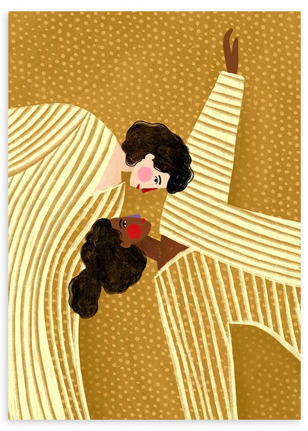 Cuadro ilustrado colorido de Bea Muller que muestra a dos mujeres en armonía, vestidas con prendas de rayas en tonos dorados sobre un fondo moteado. La obra transmite cercanía, equilibrio y calidez, convirtiéndose en una pieza ideal para aportar un aire artístico y contemporáneo a cualquier espacio de tu hogar.