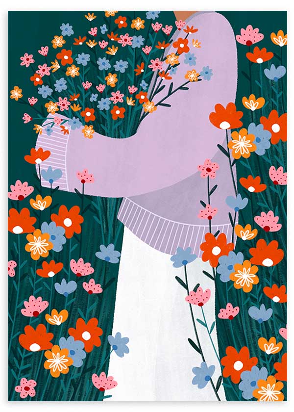 Cuadro ilustrado colorido de estilo moderno creado por Bea Muller. Representa a una mujer sosteniendo un gran ramo de flores silvestres en tonos rojos, naranjas, azules y rosas, que se integran con el campo florido que la rodea. Una composición alegre, fresca y llena de vitalidad, perfecta para dar un aire natural y optimista a cualquier estancia.